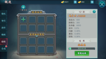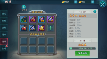 1、点击“一键添加”后背包中的战骑、法器、灵宠、仙羽、神兵、灵武多余装备进行熔炼;
