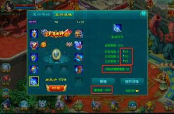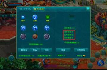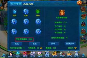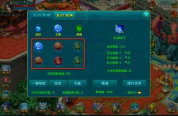 2)消耗五行聚魂值可以提升五行灵珠的等级,从而提高各项五行属性,等级越高消耗的聚魂值越多。