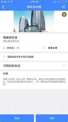 蜻蜓停车主要实时展示用户所在地区的停车场信息,包括车位信息、导航、全景和路线图等,并且提供车位寻找、停车记录、缴停车费等功能。
