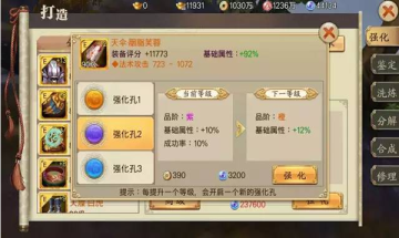 装备强化会增强装备的额外基础属性,每次需要花费灵气和铜钱,强化效果加成有白、绿、蓝、紫、橙5种不同结果,对应不同的数值加成,如果对强化后的结果不满意,可以进行反复强化,直至达最高等级的橙色强化为止。