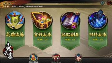 进入单人副本就可以看到英雄试炼、金钱副本、经验副本、材料副本。通关这些玩法将会获得大量的伙伴碎片、神兽图腾、银币和经验。