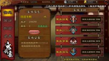 进入家族活动就可以进入各种家族玩法系统,有家族封魔家族BOSS,家族争霸,家族海运,通过家族玩法不仅可以获得经验、银币、材料等还可以获得大量家族贡献,用来在家族商店消费。