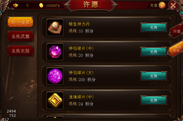如果运气不好,也不需要担心。每进行一次许愿,你可以获得许愿积分。许愿积分的用处非常大,可以兑换道具、高级武器、高级衣服等等。点击许愿面板左边的【奖池保底】即可进入许愿积分兑换页。