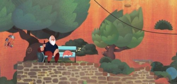 3.触发剧情:点击睡觉的懒猫,猫就会惊醒,然后跳到前面的房顶上,老人也会起身准备继续前进。