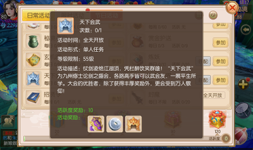1、打开活动面板点击参与“天下会武”,匹配成功后将弹出确认面板,点击进入后将会传送至战场内;