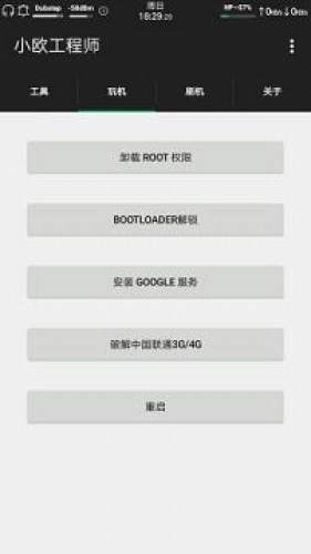 小欧工程师2017最新版是小欧工程师官方最新更新发布版本,该版本能够更好的让玩家朋友一键ROOT,一键卸载ROOT,破解联通3G|4G等诸多功能,需要的朋友欢迎下载使用。