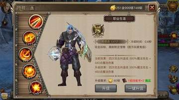 职业技能分为普通攻击、控制技能、AOE技能、BUFF技能、怒气技能5种,技能随着角色等级的提升解锁。技能解锁后,可以通过消耗金币,使用技能书提升技能效果。