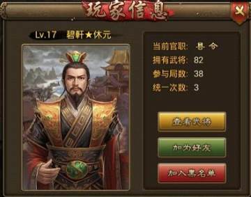 点击任意外交系统里面的任意玩家,都可查看该玩家的信息。等级,官职,参与局数,统一次数,武将数量均可查看。从其个人信息,可判断其实力强弱,点击查看武将按钮,可查看该玩家的武将阵容。、