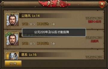 如果您的战力较低,而又遇到非常强大的对手,则可点击投降退出该局游戏重新开始,但是需要注意的是,需要到世界时间公元220年后方可投降。这样的目的是防止作弊,以保证游戏内公平性。