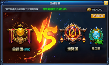 宣战成功后,未宣战同时未被宣战的第三国自动以盟国身份支援国力较弱的国家,确定攻守双方成员后,界面将变为进攻方VS防御方,上方出现国战倒计时。