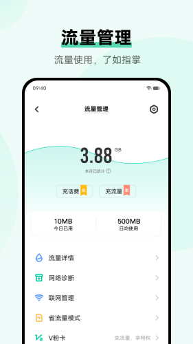 【流量监控】在“流量监控”界面,您可以查看与手机流量/网速等相关的信息详情。