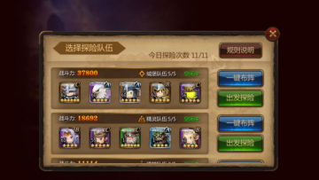 4、每个阵营都可以组成一支队伍进行工会探险,每支队伍最少3个英雄才能进行,每日探险次数限定10次,可以获得各种稀有资源