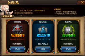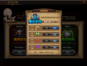 通过金币试炼可获得大量金币,分为简单、普通、困难、英雄四个难度,三星通关即可进行扫荡,每天限定挑战2次。