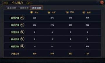 4)“资源信息”显示四大资源(木材、铁矿、石料、粮草)的生产情况,包括领地和城市产量、同盟和据点加成、维持消耗量等。通过资源产量的情况,玩家可以知道那些资源有余,那些资源紧缺,从而在扩张过程中有意地占据并争夺相关领地。