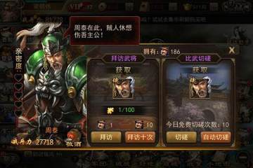在主线收复城池菜单中,可查看城池所对应的武将,和武将进行切磋,胜利后可获得该城池守将将魂。拜访无需战斗,消耗指定道具可换取该城池守将将魂。