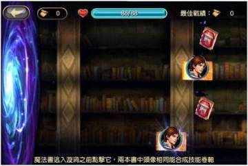 规则介绍:这是一个考验记忆力与反应能力的消除类游戏。在体力耗尽之前,点击屏幕上移动的魔法书,翻开书中的头像;若两本书头像相同则它们将合成技能书,若头像不同则两本书重新合上;若在魔法书达到最左边漩涡处之前仍未成功配对,则魔法书将从漩涡处消失。翻开魔法书与魔法书从漩涡处消失都将各消耗1点体力。配对不同颜色边框的头像依据白、绿、蓝、紫、橙、金的顺序获得越来越多的技能书。