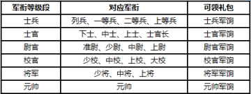 军衔分为6个等级段,20个等级,每周可以根据等级段领取礼包奖励,如下: