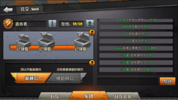 当玩家的角色等级到达12级时,可以创建或加入军团;在军团中可以和军团成员一同研发单位,交流游戏心得,领取战功宝箱。