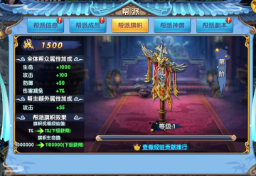 2.帮派旗帜:帮派旗帜有等级,可升级,帮派旗帜有属性,升级后属性增加。旗帜升级:、帮派旗帜有自己的经验条,当经验条满了之后,帮派旗帜自动升级,经验值来源主要有三个,
