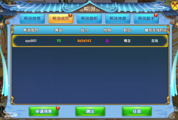 1.帮派成员:帮派成员主要是用来展示该帮派有哪些成员。帮主可以查看申请列表,可以提出和任命帮派里面的人。