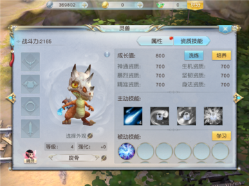 3、灵兽资质技能 在灵兽资质技能界面,可以看到该灵兽的“星级”“成长值”“技能”等属性;
