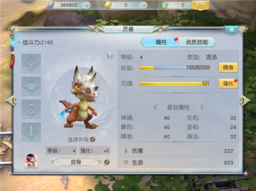 2、灵兽属性 点击已拥有的灵兽,可以查看该灵兽的各方面“属性”,例如:“等级”“经验”“伤害”“生命值”等等,点击右侧面板的资质技能可以查看该灵兽的“资质技能”;