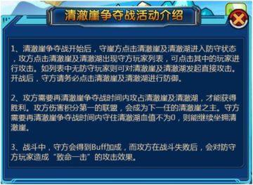 清澈崖争夺战在开服7天后,且服务器中联盟个数大于4个时开启,只有排名前十的联盟才能参加清澈崖争夺战。