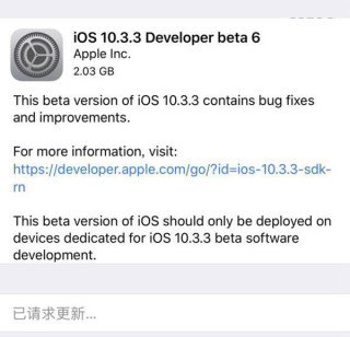 苹果在今天更新了iOS10.3.3开发者测试版Beta6,本次更新的主要内容是修复Bug和改进,更新包大小为2.03GB。