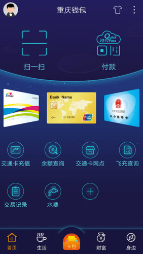 包括生活、财富、卡包、身边及账户五大版块。用户将银行卡、公交卡、会员卡等金融IC卡虚拟到APP中,出门不需再带各种卡片,通过手机二维码即可实现便捷刷卡消费。