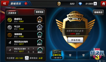 提到PVP玩法,《美职篮梦之队3》开创的实时竞技玩法首推巅峰竞技赛。这一模式率先开创了体育游戏之中的实时竞技玩法,受到了玩家们的一致好评。系统将根据球队的积分为玩家实时跨服匹配对手。巅峰竞技赛在每天的上午9点到次日2点之间开放,玩家可在此期间冲刺段位。同时,巅峰竞技也融入了当前大热的排位赛模式,用户通过战胜对手获取积分,提升段位,最终在赛季结算的时候获得更为丰厚的排名及段位奖励。最强王者之位等待着诸位前去摘取,用闪耀的荣誉来证明球队的实力吧!