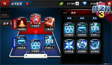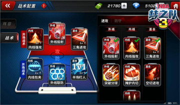 当配置好球星阵容之后,玩家就可以着手设置球队战术了。战术主要分为进攻和防守两大类,每类战术又细分为内线、外线和混合3种,每种战术又有多种不同的效果。通过装配不同的战术卡,玩家可以决定上场时使用的战术——战术卡无需购买,只要球队达到一定的等级之后即可解锁高级战术。同时,战术卡也是需要升级培养的,高级的战术卡将使球队的临场发挥更加成熟。