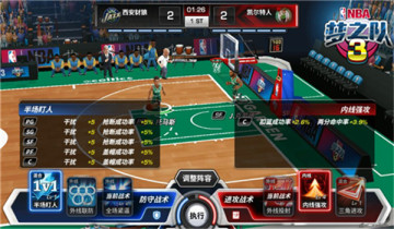 完成所有的准备工作之后,玩家就可以开启美职篮的梦幻之旅了。与一般的NBA手游不同,进入比赛后,玩家并非纯粹的看客,还需要通过操作来实时调整球员阵容和球队战术,调整按钮就在屏幕下方的正中央。当球员体力不足时可用替补球员替换,对于比赛任务中的特殊达成条件,如盖帽次数、抢断次数等,也可以通过调整战术来实现。