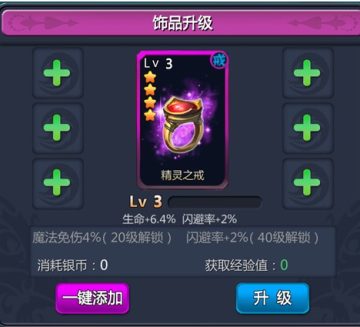 强力的饰品装备上之后,还要注意升级。饰品升级吞噬经验饰品或其他一些可吞噬的低等级饰品。经验饰品可由活动副本“经验饰品”获得,夺宝中也可以抢夺经验饰品碎片,除此之外开宝箱等也有很大机会获得经验饰品