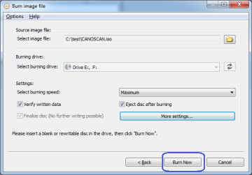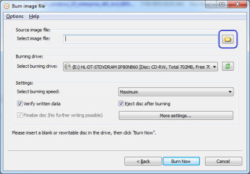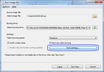 3.点击“更多设置...”按钮。弹出“烧录设置”对话框。它将列出所有连接的作者。选择要刻录到的驱动器,然后单击“确定”退出对话框。
