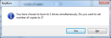 如果份数设置为1,并且您同时选择刻录到2个驱动器,AnyBurn将提示您将复印份数设置为2。