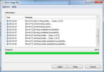 5. AnyBurn将同时开始将图像文件写入所选驱动器。您可以看到每个驱动器的详细进度信息。刻录完成后,您将看到消息“Burning completed successfully”。如果选项“验证书面数据”被设置并验证成功完成,您将看到消息“验证媒体成功完成”。