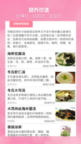 【营养食谱】孕早期、孕中期、分娩前、坐月子、产后恢复等阶段食谱;控制血糖、预防便秘、预防贫血等孕妈应对各种情况的功能食谱。