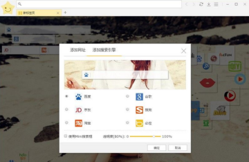 1, 快速访问页,可以自定义浏览器背景和启动页的收藏夹图标,将收藏夹中的网址添加到启动页,可以自定义图标文字和颜色,支持透明设置,并且可以像桌面一样随意拖动,不遮挡背景图片。