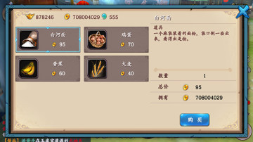 首先我们在接任务之前先做一件事,去找糕点商人(地图最左边的中间位置),买齐他的四样物品白河面、鸡蛋、香蕉、大麦,然后找布料商人(地图最右边的中间位置),也是买齐他的御寒的毛皮、灵蚕丝、紫色布匹、霓裳羽衣。携带上限只有一个,所以想买多也不行哦。