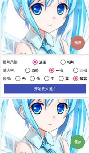 这是一款借助waifu2x通过七层神经网络算法对动漫风格的图片和照片进行放大的安卓工具,可以把低质量的图像进行降噪处理无损放大,对二次元漫画动漫图片尤为使用。这是一款良心应用,无广告,无捐赠,开源代码。