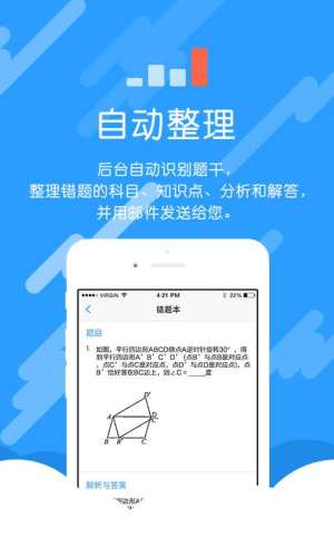 我们主打错题本整理功能,只要您拿着手机对着错题,轻轻按下拍照按钮,