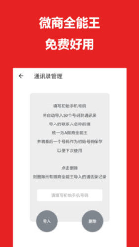 可一键导入50个精准客源到通讯录,并可一键删除所有已导入的微商客源。