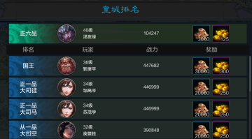 主城中选择皇城可参与皇城争霸玩法,在这里,本国各位主公靠实力来决定各位的官阶,从国王、正一品到九品不等,其中每个国家国王只有一名,其余各官阶数量不等。