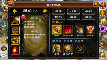 周瑜的第一个技能是单攻击落石,可以召唤一块陨石直接打击敌方武将!虽然只能攻击一个目标,但是周瑜攻击高,打起来还是很疼的!而且这个技能的冷却还是蛮短的,一次对战可以多次使用。