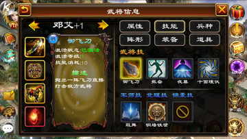邓艾的第一个技能是御飞刀,也就是抛出一阵飞刀直接打击敌方武将。虽然只是单攻击,但是实际使用效果还是不错的,攻击高的话一下过去也能打残对方,而且邓艾的冷却都比较快!