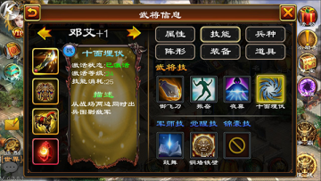 再来看看我们邓艾的大招——十面埋伏!这个大招还是挺有用的,会从战场两边同时出兵围剿敌军!虽然召唤出来的兵不是特别多,看起来没什么气势,但是杀伤力还是蛮高的,一下子过去也能清掉不少兵!主公们可以先上第二个技能,提升了武力后,再用十面埋伏,效果灰常不错哟!