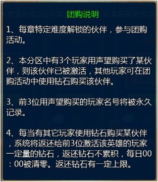 2、本分区中有3个玩家用声望购买了某伙伴,则该伙伴已被激活,其他玩家可在团购中使用钻石购买该伙伴。