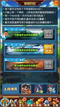 狼烟四起设有三个不同的副本,每个副本设有多个关卡。该玩法只能上阵一个佣兵,选择副本前需要先选择佣兵,上阵的佣兵若为副本指定的佣兵可以获得翻倍的基础奖励。