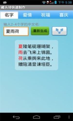 不错又好玩的软件,能将你的名字藏在一首诗词里面。软件提供了四种作用的藏头诗:名字、爱情、祝福、喜庆。用户可以把生成的诗用短信、微博等形式分享给好友