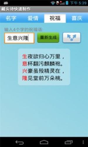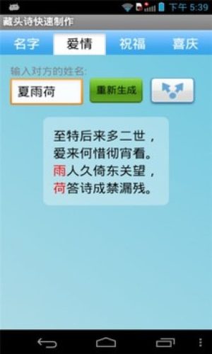 藏头诗快速制作app是手机上自动生成藏头诗的一款android软件,使用本款软件可以一键自动生成诗句,简单方便,可以制作表白藏头诗,比如某某我喜欢你等。